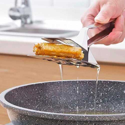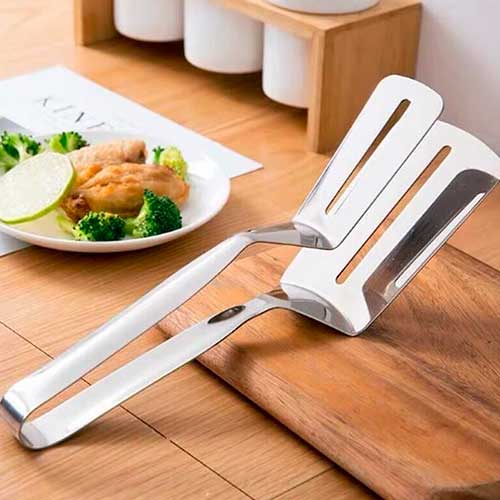 Utensilio innovador 2 en 1: pinza y espátula de acero inoxidable. Perfecta para voltear, sujetar y servir alimentos fácilmente. Resistente, duradera y fácil de limpiar.